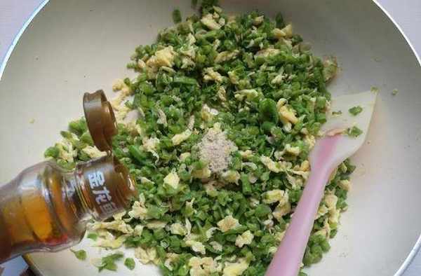 5、最後加入雞粉或者雞精,適量的香油,攪拌均勻,這樣一份清香可口的雞蛋豇豆角餃子餡就拌好瞭。