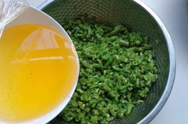 3、豇豆角擇洗幹凈,入開水鍋焯熟,撈出晾涼後切碎,倒入適量食用油拌勻。