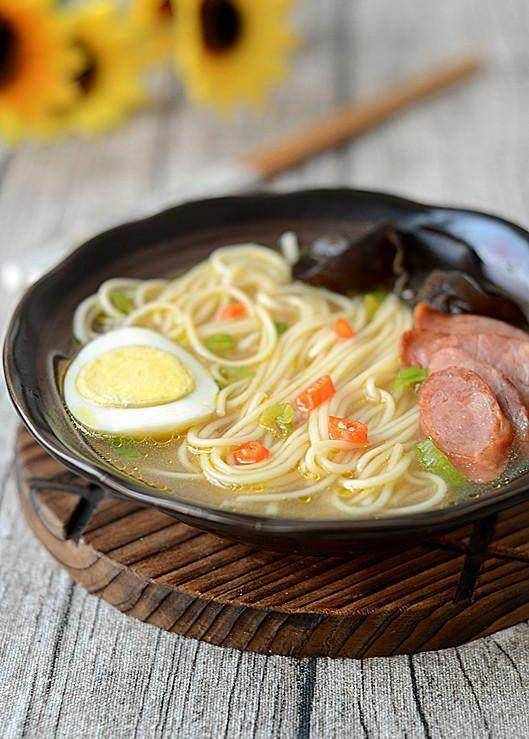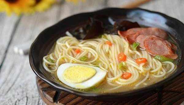 食材:掛面50克,胡椒粉半茶匙,油1湯匙,鹽適量,芝麻油少許,醋1湯匙,蔥1段,水煮蛋1個,紅椒1個,黑木耳適量,香腸1根。
