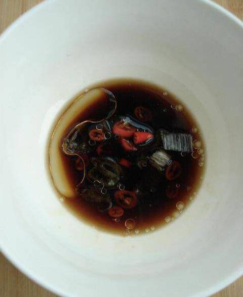 7、取一個碗,碗裡放入醋、生抽、鹽、胡椒粉、紅椒、蔥末、芝麻油拌勻。
