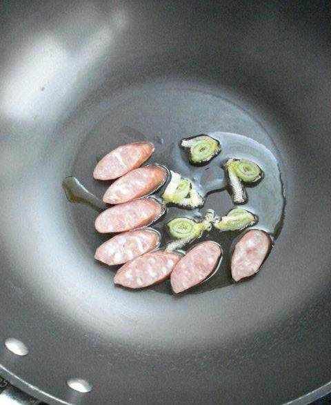 3、再把香腸放進去翻炒幾下。