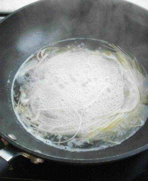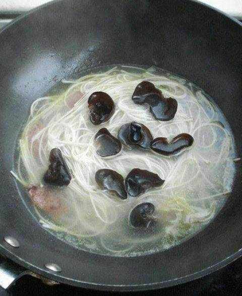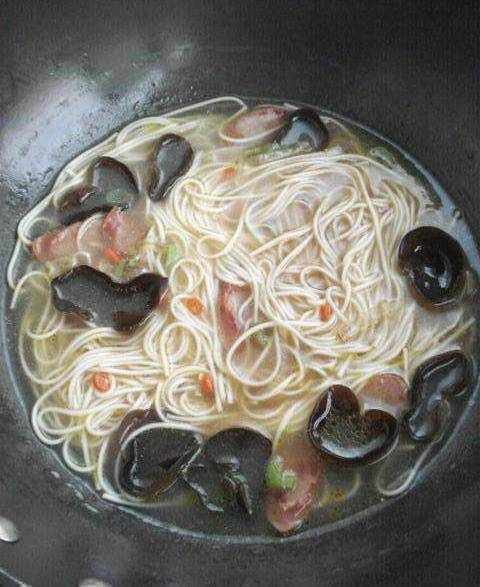 6、把洗好的木耳放進去,然後用大火將水燒開,隨開隨點冷水,煮至掛面沒有白芯。