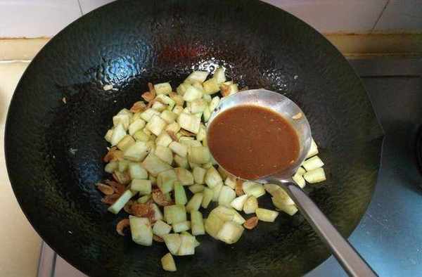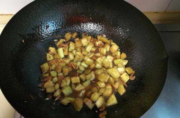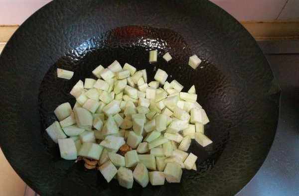 5、將茄子丁放入鍋中;