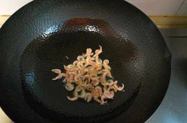 3、炒鍋中放入適量調和油,然後將蝦皮放入鍋中;
