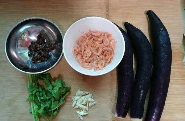 【食材】紫茄子3個,蝦皮20克、香菜30克、大蒜20克、黃豆醬50克、調和油15毫升、面條200克