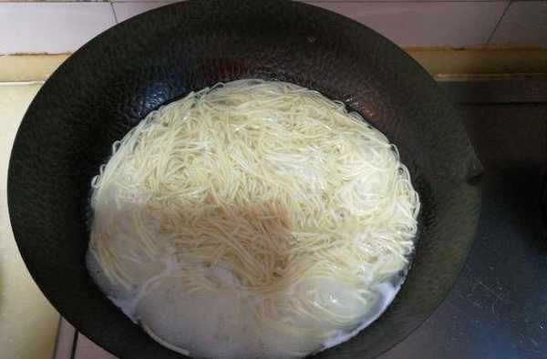 10、鍋中放入適量水,水沸騰後將面條放入鍋中煮熟,煮面的過程中要點入兩次涼水,這樣做可以讓面條裡外全熟無硬芯;