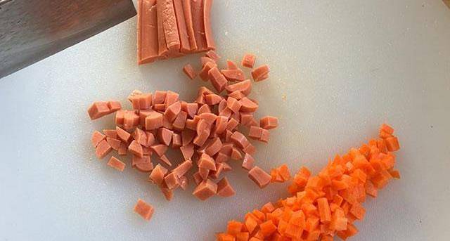 第一步:現成的蛋撻皮和芝士碎取出來解凍。玉米粒剝下來並清洗幹凈,胡蘿卜洗凈後切成細丁,火腿腸切成細丁備用。