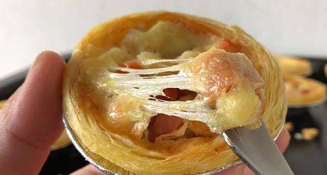 第四步:把準備好的所有食材放進蛋撻皮裡面,再撒上多一點的芝士碎。
