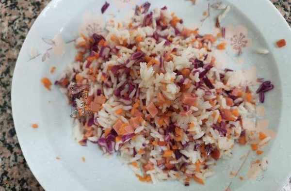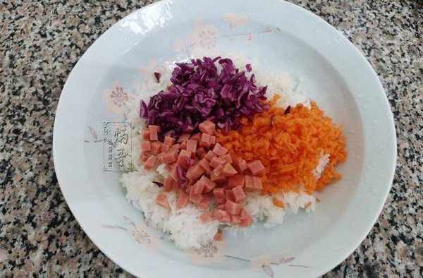 食材都準備就緒後,我們先將米飯放入幹凈碗中,之後加入切好的紫甘藍丁、胡蘿卜丁等物進行攪拌。
