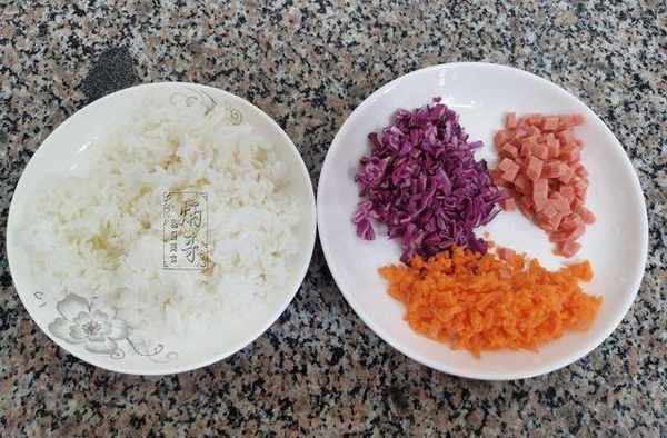 制作噴香煎米餅的第一步,首先我們將煮熟的米飯拿出,隨後開始將準備好的紫甘藍以及胡蘿卜、香腸切成丁狀備用。