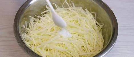 洗凈的3個土豆去皮,切成細絲,也可以用刨絲器,這樣更省事。切好的土豆絲不用過水。將土豆絲放入幹凈盆中,接著往盆中加入食鹽,雞精,孜然粉,胡椒粉,攪拌均勻,攪拌好後醃制10分鐘。