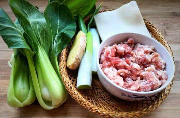 材料:肉餡1小碗,青菜4份,餛飩皮3元,蔥根1根半,生薑1片,餡料調味:鹽、生抽、蠔油。胡椒湯:蝦皮、香菜、紫菜、生抽、鹽。