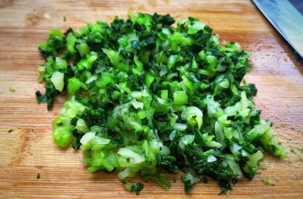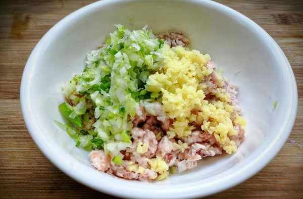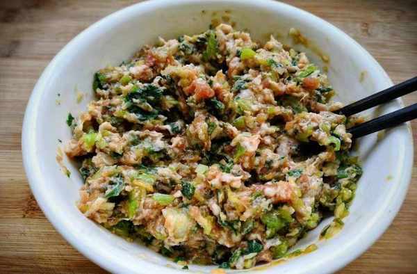 5. 將切碎的青菜與肉拌勻,加入鹽、生抽、蠔油和胡椒粉拌勻。