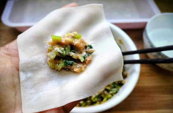 6. 取一張餛飩皮,中間放一勺餡。
