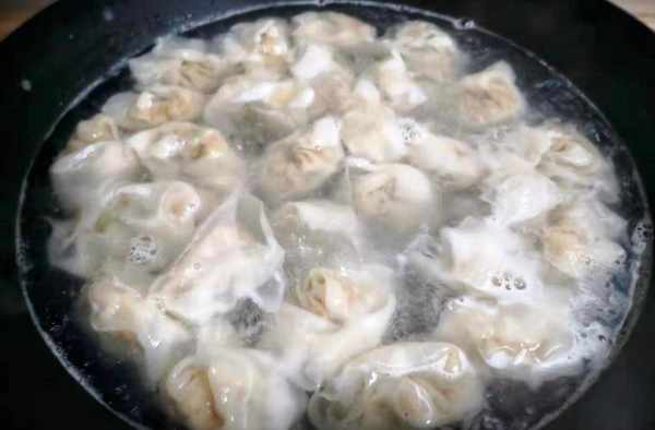 9、鍋中加入適量的水,大火燒開後,加入餛飩,盡量多吃,燒開後再加水3 - 5分鐘,餛飩就腫脹浮起瞭。