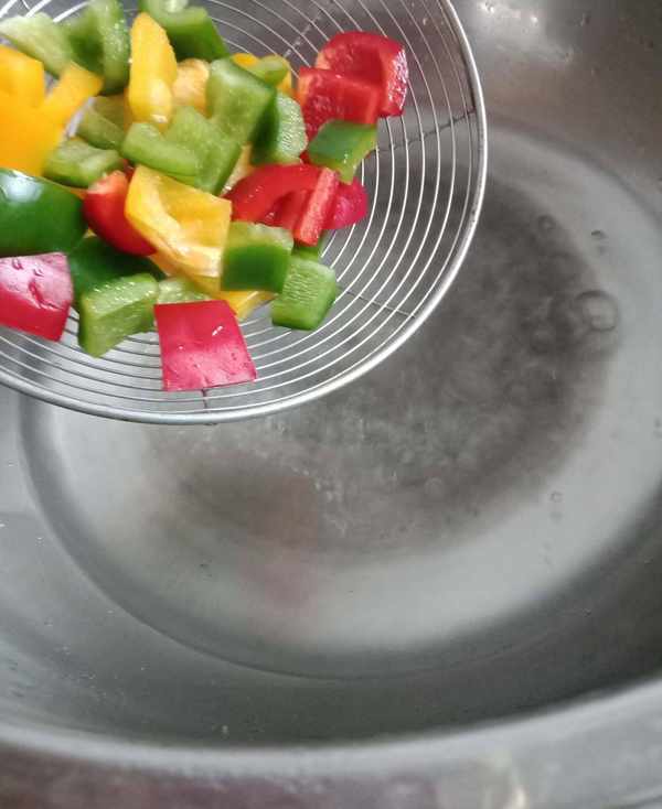 5,將彩椒焯水斷生,彩椒也可以生吃,不介意的話可以不焯。