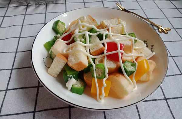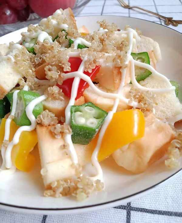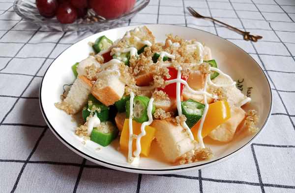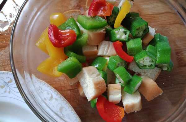 準備食材:藜麥、彩椒、秋葵、面包、沙拉醬。
