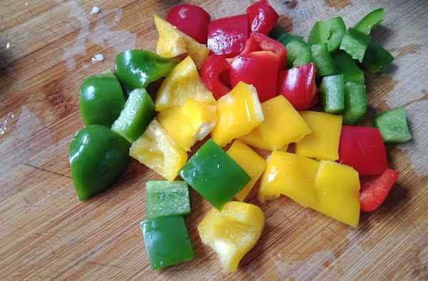 4,將彩椒切丁,大小和面包塊差不多就行。