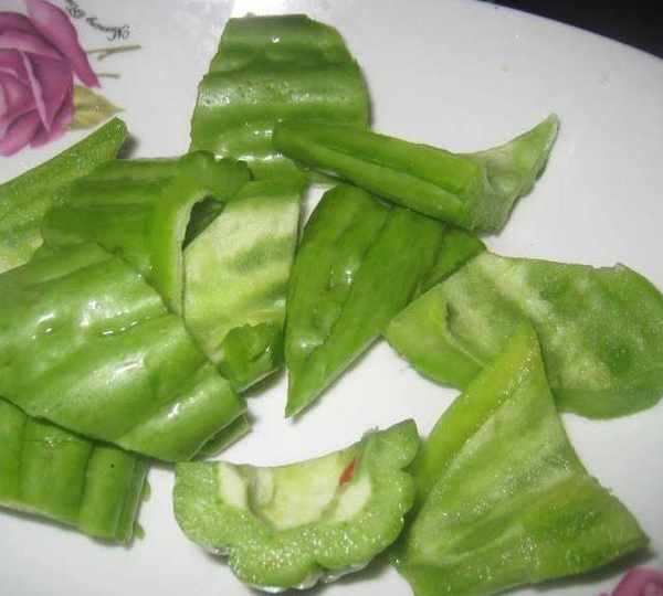 第4步、涼瓜洗凈,去蒂,對半切開後去籽;切成適量大小的塊備用;