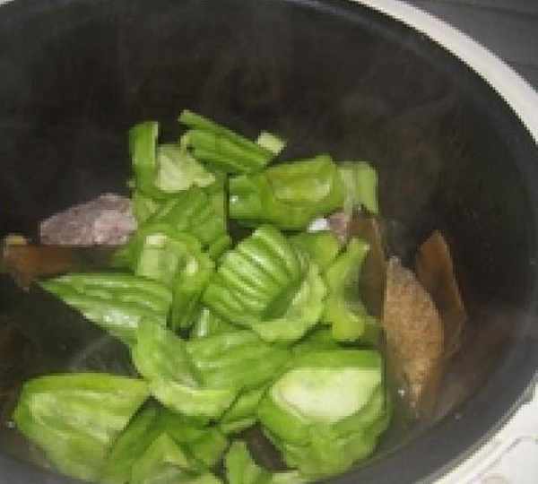 第5步、把薑片,排骨,黃豆,陳皮,海帶和涼瓜等入電飯煲中;