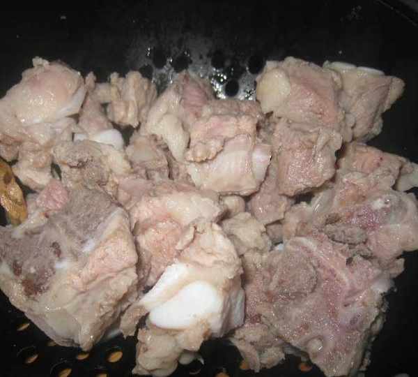 第3步、排骨砍成適量大小的段,洗凈,和薑片一起冷水下鍋,焯掉血沫;再用冷水過凈,瀝幹;