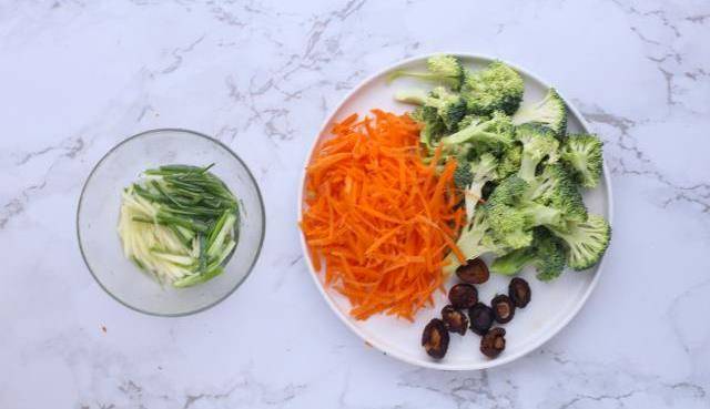 做法:1、西蘭花用淡鹽水浸泡後用手掰成小朵,胡蘿卜去皮切成絲,小香菇泡發,薑去皮切絲,蔥拍扁切蔥段。蔥段和薑絲放入碗中,加清水浸泡,濾出汁水制成蔥薑水待用。