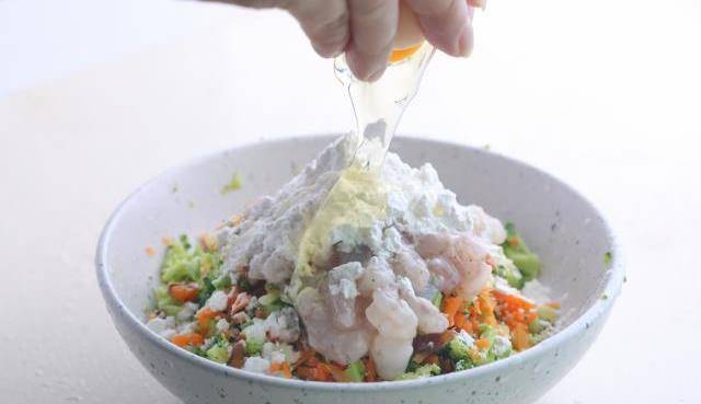 5、將醃制好的蝦仁碎多餘的水分濾去,與西蘭花、胡蘿卜、香菇一起混合放入碗中,加入鹽、淀粉,打入一個雞蛋,用筷子朝一個方向不停攪拌均勻。
