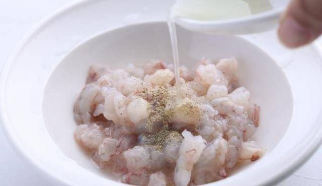 2、鮮蝦去頭、去殼、去蝦線,用清水沖去表面的黏液,然後剁碎些,不用剁太細碎,保留大顆粒蝦肉口感更好些。蝦仁中加少許白胡椒粉、一湯匙蔥薑水攪拌均勻,醃制一會兒。