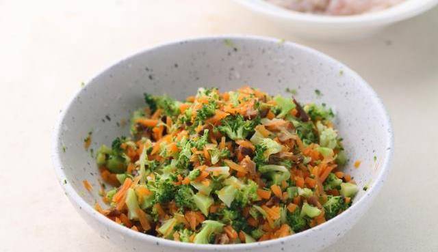 4、接著將西蘭花、香菇、胡蘿卜絲分別切細碎,充分擠幹水分,放入大碗中。