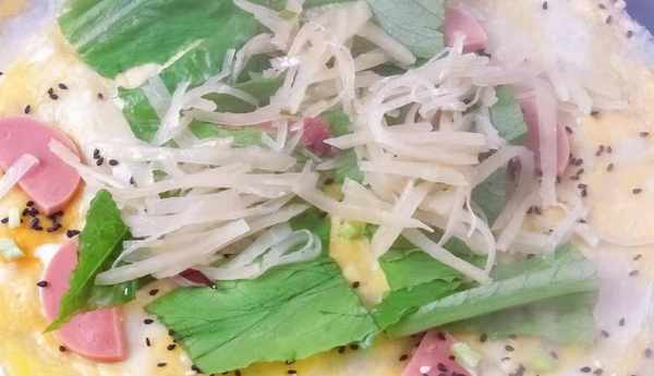 第四步,雞蛋半凝固狀態時,往上面放入火腿,撒入蔥花和芝麻,繼續烙制,直到雞蛋完全凝固。