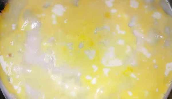 第三步,往面餅上打入一個雞蛋,繼續用刮板刮勻,大約三十秒左右,雞蛋開始慢慢凝固。