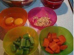 媳婦兒用兩個雞蛋,一個胡蘿卜,還有芹菜,蝦皮一點點,還有面粉,花生油,東西準備好之後,把胡蘿卜去皮,切成小段,芹菜也切成段兒,然後把它們全剁碎之後,如果有那種攪拌機的話,可以用那種攪拌機器攪拌!