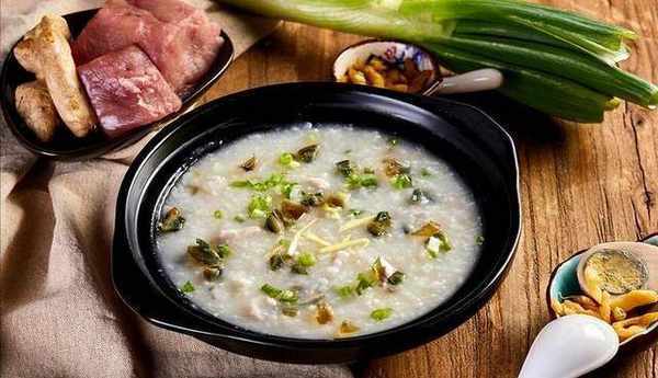 3.大米燒開之後用中火繼續煮沸25分鐘,然後再把準備好的豬肉加進來。放少許的薑絲。快速地煮至三分鐘。皮蛋兩個切成細丁,把它放入鍋內,快速煮制半分鐘。煮好之後就可以撈出食用瞭。