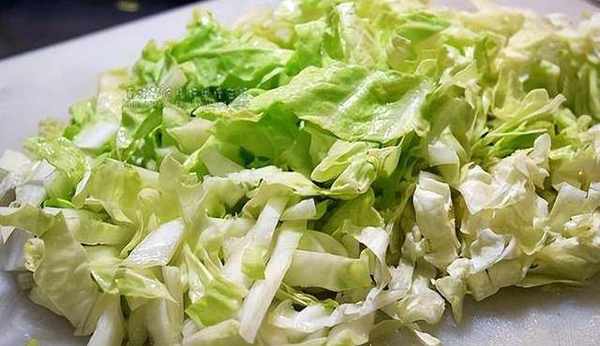 1.首先準備新鮮的白菜一顆,放在清水中,沖洗幹凈。白菜幫與白菜葉分離,白菜,幫用菜刀切成細絲。然後把白菜葉用手撕成小塊。大蔥一根切成蔥花。