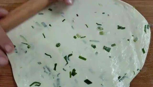 面團已經醒好瞭,手上抹油,再次揉面,揉成軟硬適中的光滑面團,放置一邊。洗凈的小蔥切碎,切好盛入面盆中再次揉面。揉好之後蓋上鍋蓋,醒面10分鐘。醒好以後,案板上抹食用油,取出面團一分為二,分成兩個小面劑,一小面劑搟成薄餅。用圓蓋子印出圓形小餅。在所有的圓形小餅弄好後,鍋中燒有油,油熱放入小圓餅生胚,炸至定型翻面,炸至兩面金黃,撈出控油,金黃酥脆的早餐,小油餅就做好瞭,看著就特別的有食欲。