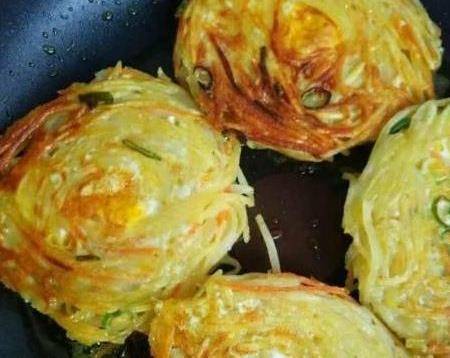3.先把鍋開小火預熱,然後在鍋中倒入適量的油,把剛才揉好的菜團放入平底鍋中,做好一個放一個,然後再往還在鍋裡面的菜團加入準備好的雞蛋液,蓋上鍋蓋煎1分鐘左右,時間到瞭以後加入一點點清水,水隻到菜團的三分之一處就行瞭,然後再蓋上蓋子,把水控幹;最後再把小餅翻個面,再煎3分鐘左右,等到兩面都變成瞭金黃色,這個蘿卜土豆雞蛋餅就做好瞭!