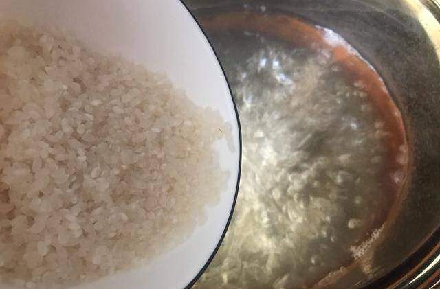 3、倒入瀝幹水分的大米,中小火熬煮。