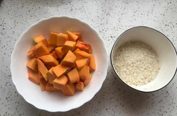 1、準備好食材,大米洗凈,冷水泡20分鐘,南瓜去掉外皮,洗凈切塊。如果早上煮,晚上睡前大米浸泡上,南瓜切好。