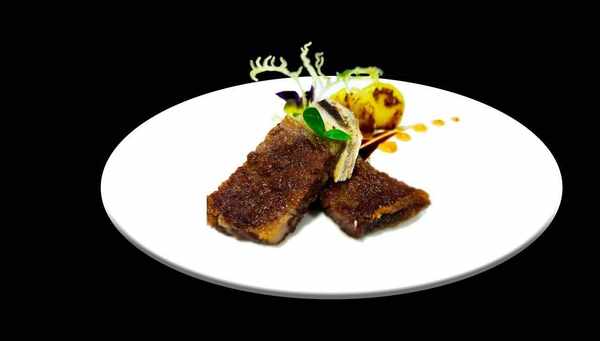 醃制好的牛仔骨吸幹水分,兩面拍上面粉煎至金黃,撈出砍成塊擺盤即可。