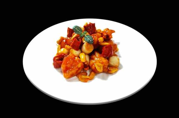 起鍋下入調好的糖醋汁水,下入龍蝦球收汁,淋入花椒油出鍋裝盤,用黃飛鴻花生和食用花草點綴即可。