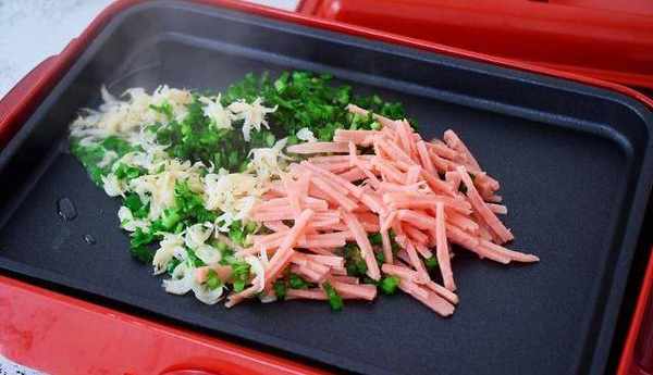2、美食鍋放入平板烤盤預熱後倒入適量的食用油燒熱,放入韭菜、火腿、蝦米翻炒至熟盛出備用