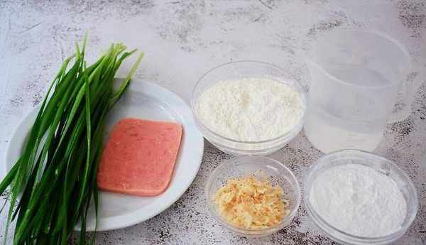 所需材料:普通面粉125克,糯米粉50克,純凈水350克,韭菜50克,蝦米10克,火腿1片,糖半茶匙,鹽1茶匙,胡椒粉少許,食用油適量