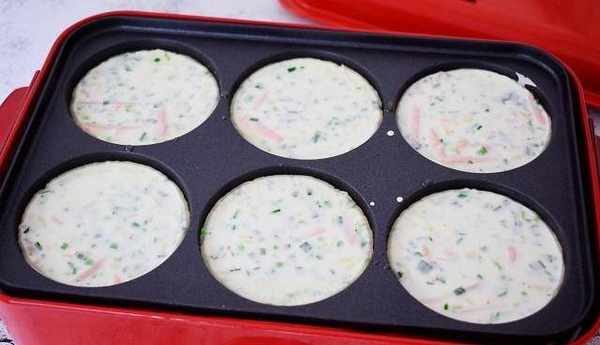 5、美食鍋放入6圓孔多用途烤盤,調節至中溫,預熱電熱鍋4分鐘後刷一層油,再將面糊註滿每一格,煎至金黃色後再翻另一面,繼續煎至金黃色即可