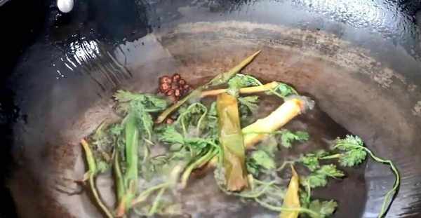 3.給炒鍋中倒進去適量的食用油,開中火加熱。等油熱瞭,先放進去兩三個八角,再放進去兩段小蔥,香菜也要放進去一把,用筷子翻攪幾下,要將它們煸炒出香味。等炒香瞭,用筷子將作料夾出來,放進漏勺中控一下油,然後丟掉不要。