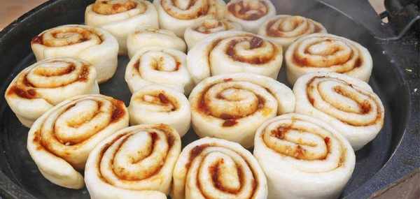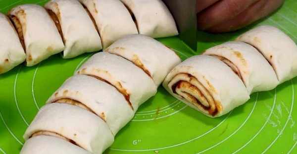 6.抓起面皮的長邊,向另外一邊卷過去,要卷得緊一些。等卷到頭瞭,把接口處給捏緊。卷好後,把長條擺放好,取出菜刀,將它切成大小均勻的小段。全部切好後,將小段放著待用。