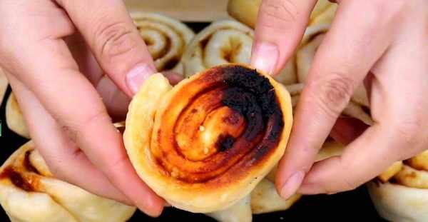 8.等時間到瞭,打開蓋子,繼續烙3分鐘。3分鐘後,拿起一個小卷可以看到,它的底部已經變得焦黃瞭。然後,給鍋裡倒進去適量的清水,蓋上鍋蓋,讓小卷在鍋裡燜3分鐘。