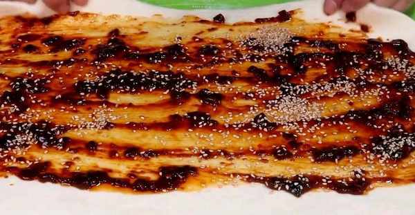 5.給案板上撒上一些幹面粉,用手鋪均勻。將打發好的面團放在案板上,用手揉搓幾下排出裡面的氣體。然後,用搟面杖將它搟薄,慢慢地搟成一張大面皮。搟好之後,把醬料舀出一些放在面皮上,用勺子將醬料給鋪平整。接著,給上面撒一些白芝麻,增加香味。