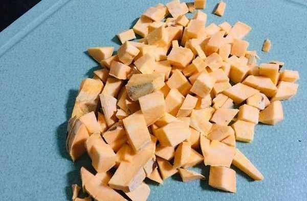第二步:紅薯也切成小丁。