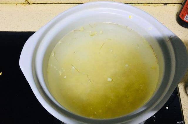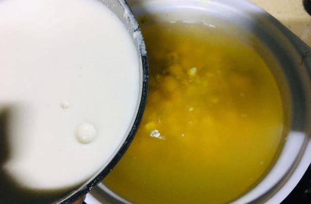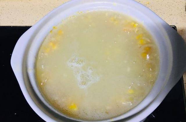 第七步:倒進去以後,大火煮開,然後小火再熬3到5分鐘就可以瞭,是不是很簡單,前前後後15分鐘就能搞定全傢人的早餐,晚餐問題。而且什麼料都不用,帶著玉米香味的甜湯,再加上紅薯的不要太好吃。
