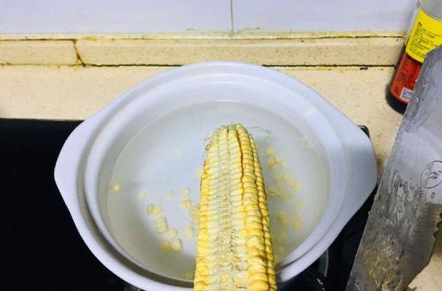 第一步:鍋中加水,我這個砂鍋把水裝滿做的晚餐,正好夠我們一傢三口人喝。然後一根新鮮的玉米,清洗幹凈以後,用刀把玉米粒直接切到鍋中。新鮮玉米很嫩很好切,不要被這陣仗嚇到哈哈。